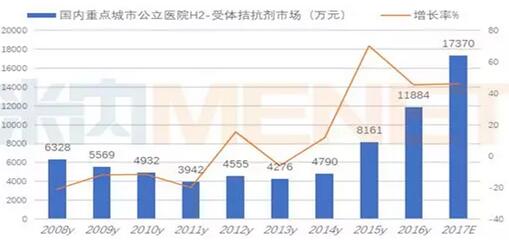 米內(nèi)網(wǎng)數(shù)據(jù)顯示,2016年國內(nèi)重點(diǎn)城市公立醫(yī)院H2受體拮抗劑用藥金額為1.19億元,同比上一年增長率為45.62%。據(jù)2017年1~3季度數(shù)據(jù)估算,2017年國內(nèi)重點(diǎn)城市公立醫(yī)院替丁類藥物市場(chǎng)為1.74億元,同比上一年增長率為46.16%。