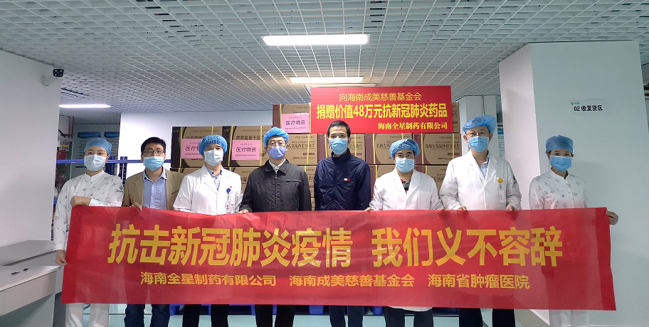 在全省上下疫情防控關鍵時期,海南全星制藥有限公司始終不忘履行社會責任,繼2月5日向海口市紅十字會捐贈107萬元的抗疫藥品后,全星再行動,2月7日,向海南成美慈善基金會捐贈價值48萬元的抗疫藥品,用于支持海南省腫瘤專科醫療聯合體下轄110多家醫療機構開展一線疫情防控工作,助力我省早日打贏疫情防控攻堅戰。